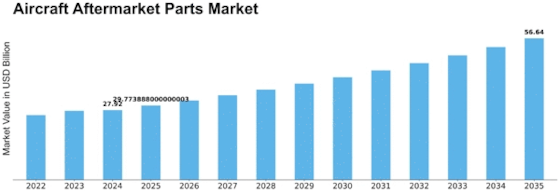 The projected market valuation for the Aircraft Aftermarket Parts Market is 56.64 USD Billion by 2035.