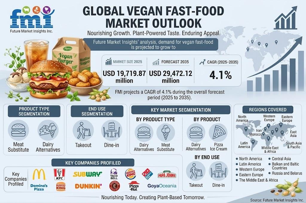 NEWARK, Del., USA | April 8, 2026 — According to the latest market analysis by Future Market Insights, the global vegan fast-food market is witnessing steady expansion as consumers increasingly shift toward plant-based diets driven by health, environmental, and ethical considerations. Valued at USD 19,719.87 million in 2025, the market is projected to reach USD 29,472.119 million by 2035, growing at a CAGR of 4.1% during the forecast period.