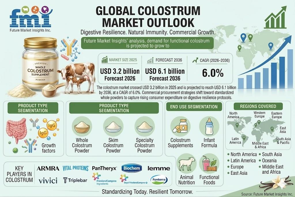 NEWARK, Del., USA | April 8, 2026 — According to the latest market analysis by Future Market Insights, the global colostrum market is witnessing steady structural expansion, driven by rising preventive health awareness, increasing demand for bioactive nutrition, and advancements in dairy processing technologies. Valued at USD 3.4 billion in 2026, the market is projected to reach USD 6.1 billion by 2036, growing at a CAGR of 6.0%.