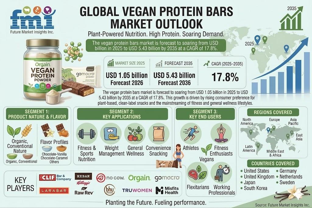 NEWARK, Del., USA | April 8, 2026 — According to the latest market analysis by Future Market Insights, the global vegan protein bars market is poised for exponential growth, driven by rising adoption of plant-based diets, increasing demand for functional nutrition, and the growing popularity of convenient, on-the-go snacking. The market is projected to expand from USD 1.05 billion in 2025 to USD 5.43 billion by 2035, registering a robust CAGR of 17.8% during the forecast period.