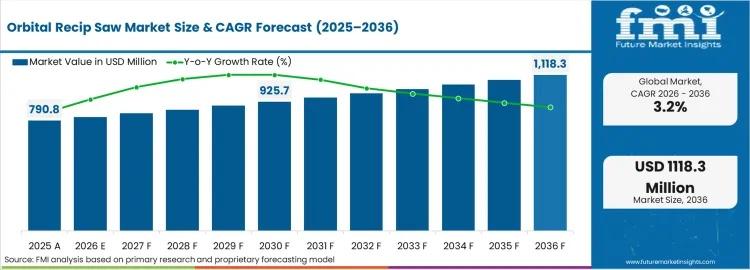 The global Orbital Recip Saw Market is witnessing steady expansion, supported by rising construction activity, technological advancements, and the rapid adoption of cordless power tools. According to recent analysis, the market was valued at USD 790.80 million in 2025 and is projected to reach USD 816.11 million in 2026. Over the long term, it is expected to grow to USD 1.12 billion by 2036, registering a CAGR of 3.20%.