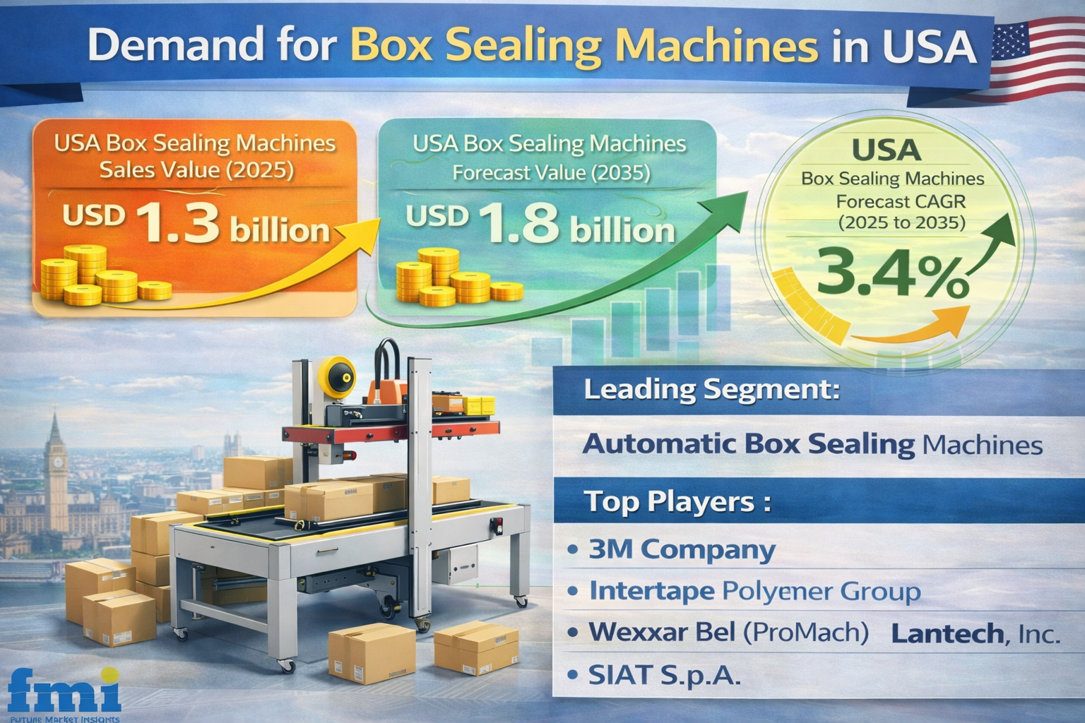 The demand for box sealing machines in the United States continues to rise steadily as packaging automation becomes a structural requirement rather than an operational upgrade. Valued at USD 1.3 billion in 2025, the market is projected to reach USD 1.8 billion by 2035, growing at a CAGR of 3.4%. This expansion reflects the persistent growth of e-commerce, regional distribution hubs, and industrial manufacturing, where speed, consistency, and labor efficiency are critical. Box sealing machines play a decisive role at the end of packaging lines, ensuring cartons are securely closed for shipment, storage, and handling. As parcel volumes increase and labor costs remain elevated, US facilities are prioritizing automated sealing solutions that reduce manual intervention while maintaining uniform packaging integrity across high-throughput environments.