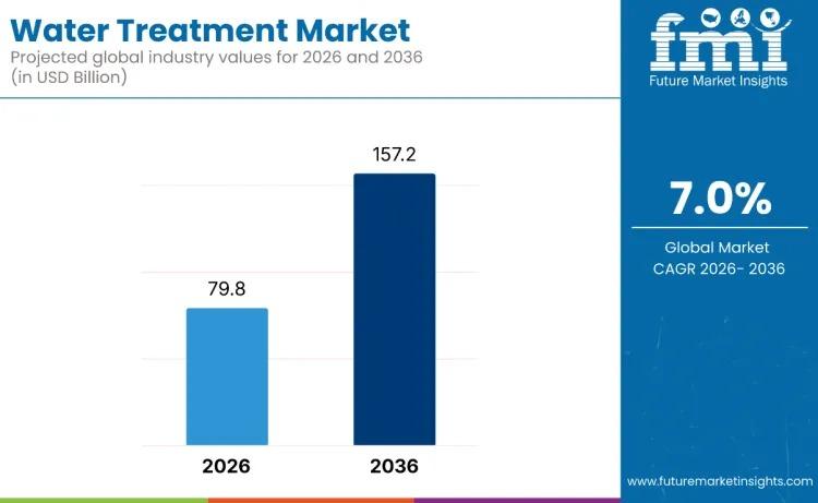 The global Water Treatment Market is entering a decisive growth phase, supported by urgent water security challenges and accelerating infrastructure investments. Valued at USD 79.8 billion in 2026, the market is forecast to nearly double, reaching USD 157.2 billion by 2036, expanding at a steady CAGR of 7.0%. This growth reflects mounting concerns around water scarcity, pollution, and regulatory compliance, alongside the growing need for safe, reliable water across municipalities and industries.