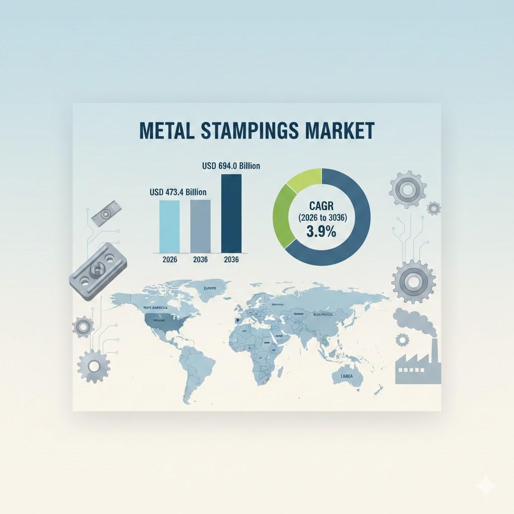 The global Metal Stampings Market is projected to grow from USD 473.4 billion in 2026 to USD 694.0 billion by 2036, expanding at a CAGR of 3.9%, according to Future Market Insights (FMI). The market’s steady rise reflects structural transformation across automotive electrification, consumer electronics miniaturization, defense modernization, and smart manufacturing adoption.