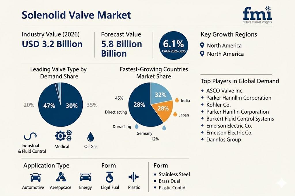 The Solenoid Valve Market is projected to grow from USD 3.2 billion in 2026 to USD 5.8 billion by 2036, reflecting a 6.1% CAGR. This growth is propelled by the shift from traditional manual valves to electrically actuated, remotely controlled systems, coupled with rising adoption of smart manufacturing and industrial IoT integration across process industries globally.